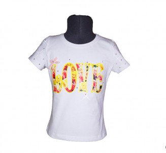 Гламурная футболка для девочки из кулирки с лайкрой. Большой красочный трансфер с цветочным принтом по груди. Рукав отделан россыпью страз. Только в белом цвете. Только такой принт.