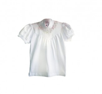 Джемпер с коротким рукавом. Рукав-фонарик из гипюра. Воротник- стоечка. По груди гипюровая V- образная вставка.