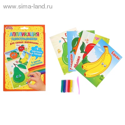 Аппликация пластилином "Фрукты" для самых маленьких, 4 картинки + 6 цветов пластилина по 10 г