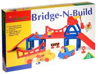 Развивающий набор для малыша "Строительство моста" - развивающая игра для малышей. Набор состоит из 24 предметов, среди которых машинки, инструменты и фигурки строителей. Если грузовик ударяется бампером, то фигурка выскакивает из кабины.
