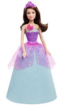 Кукла Барби предстает в образе принцессы Карин. Кукла одета в пышное голубое платье с розовой баской. На груди у куклы - украшение в виде бабочки. Если нажать на украшения, то кукла пошлет тебе свой поцелуй!