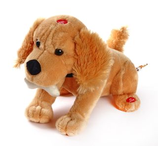 Если поднести ко рту косточку - станет лаять, скулить, садиться, поднимать лапы, делать различные движения.