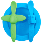 Набор посуды: голубая тарелка, зеленая ложка в форме самолета, голубая ложка в форме поезда