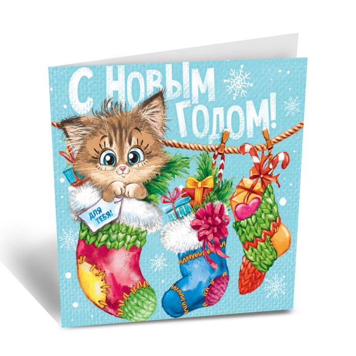 Открытка "С Новым годом" котенок в носке, 6 х 6 см