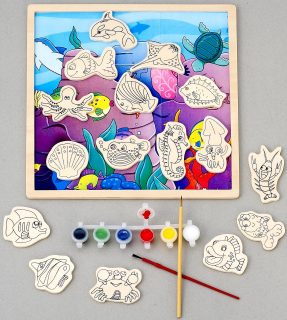 Вы только посмотрите, какая она необычная. В наборе есть цветная дощечка-фон, магнитные элементы с изображениями "жителей воды", кисточки и краски. Для начала надо раскрасить морских обитателей, а затем можно играть с ними на дощечке, создавать свой "мультфильм". Раскрашивать элементы можно не один раз, так как они выполнены из дерева. Постоянно менять цвета плавничков рыбок, хвостиков других героев - это так здорово! Игрушка развивает творческие способности, фантазию, воображение. С данной раскраской ребенок выучит основные цвета, названия морских обитателей.