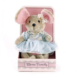 Индивидуальность образа мышки Капельки подчеркивает авторское платье нежно-голубого цвета. Упаковка, созданная в модном стиле шебби-шик, придает стилевую законченность игрушечному образу и воплощает идею готового подарка с ярким характером и большим шармом.