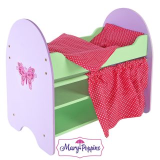 Кукольная кровать-чердак "Бабочка" сделана из экологически чистого материала - дерева. Все детали тщательно отшлифованы - игрушка безопасна для здоровья. Длина спального места - 51 см, кроватка подходит для большинства кукол-младенцев. Нижний этаж кроватки - полки для хранения. Кроватка укомплектована пологом и постельным бельем: матрасом, подушкой и одеялом.