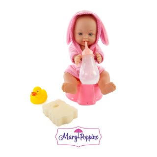 Эта малышка требует к себе особого внимания и любит, когда о ней заботятся. У куклы есть функция "пью и писаю": можно напоить ее настоящей водой из бутылочки и потом посадить на горшок. Игрушка предназначена для сюжетно-ролевых игр. Рост куклы 30 см. У куклы твердое тело, ее можно купать. В комплекте с куклой имеется мочалка и игрушка для купания. Кукла одета в милый купальный халатик с капюшоном с ушками.