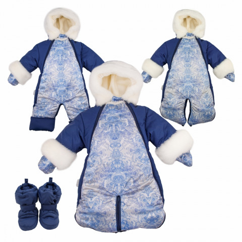 "Зимний комбинезон на меху с двумя застежками. Нижняя часть комбинезона трансформируется в ЧЕТЫРЕ варианта: 1. мешок для ножек новорожденного младенца, 2. закрытые (застегнутые на молнии) штанины для подросшего грудничка, 3. открытые штанины с отворотами из имитации меха норки для малыша, который сидит, 4. открытые, удлинённые развернутыми отворотами штанины для ходящего малыша на второй год нОски. Рукава так же имеют отвороты из норки. В комплекте меховые рукавички и меховые утеплённые мягкие сапожки. Глубокий, хорошо проработанный капюшон имеет затяжники и утепление контура имитацией меха норки. Подклад так же из меха шерсть. Верх-непромокаемая ткань особой супер-гладкой масляной структуры с благородным богатым переливом Наполнитель - синтепон Подклад - одежный мех (шерсть 60%, п/э 40%) В комплекте к комбинезону идут рукавички и сапожки. Размеры спаренные на вырост: 20-22 (3-9 мес) и 22-24 (9мес - 1,5 года) ТМ КРОШКИН ДОМ Производитель: ООО ВИТ индустрия"
