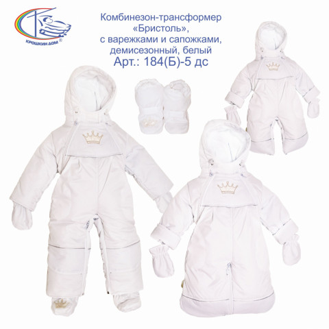 Действительно Королевский своей грациозной изысканностью, выполненный с большим вкусом в каждой детали комбинезон для малышей! Отлично дополняет всю коллекцию Бристоль в вариации <<Королевский>>! Нижняя часть комбинезона трансформируется в ЧЕТЫРЕ варианта: 1. мешок для ножек новорожденного младенца, 2. закрытые (застегнутые на молнии) штанины для подросшего грудничка, 3. открытые штанины с отворотами для малыша, который сидит, 4. открытые, удлинённые развернутыми отворотами штанины для ходящего малыша на второй год нОски. Рукава так же имеют отвороты. Глубокий, хорошо проработанный капюшон имеет затяжники. Две молнии по бокам помогут Вам легко одеть и снять комбинезон с малыша Декорирование на центральной части грудки и на правом сапожкЕ - объемная 3D вышивка в виде королевской европейской короны. Верх-непромокаемая ткань Наполнитель - синтепон Подклад - трикотаж кулир (хлопок 100%). В комплекте к комбинезону идут рукавички и сапожки. Размеры спаренные на вырост: р. 18-20 (рост 56-68см), 20-22 (3-9 мес) и 22-24 (9мес - 1,5 года) ТМ КРОШКИН ДОМ Производитель: ООО "ВИТ индустрия"