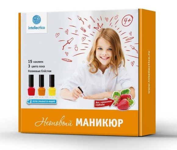 С этим набором девочка сможет создать аккуратный маникюр с неоновым эффектом . Лак абсолютно безопасен, смывается простой водой и обладает приятным клубничным ароматом. В набор входит широкая и удобная пилочка - с ее помощью ребенок сможет сформировать форму ногтей. Комплект включает стильный мешочек для хранения принадлежностей, блестки и наклейки для дизайна.