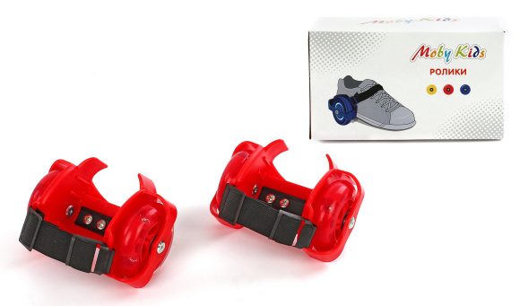 Двухколесные ролики Moby Kids надеваются поверх обуви и крепятся к ней с помощью ремешка. Во время катания колеса роликов подсвечиваются.