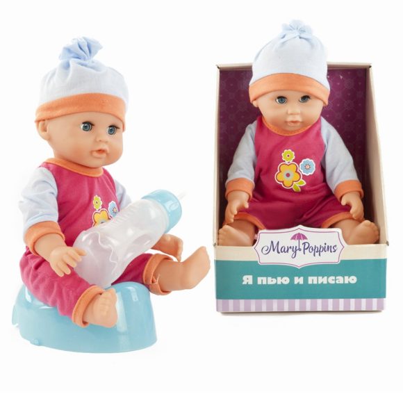 Кукла-пупс торговой марки "Mary Poppins". Предназначена для сюжетно-ролевой игры в "дочки-матери". Рост куклы 25 см. У куколки твердое тельце, поэтому ее можно купать в воде. У куклы есть функция "Пью и писаю". В комплекте с куклой поставляется горшок, бутылочка и настоящий подгузник. Можно напоить куколку из бутылочки водой и посадить на горшок или надеть ей подгузник. Кукла одета в боди из эксклюзивной коллекции "Цветочки". На голове у куклы - шапочка. В горизонтальном положении глазки у куклы закрываются. Например, если положить куколку в кроватку, она закроет глазки.