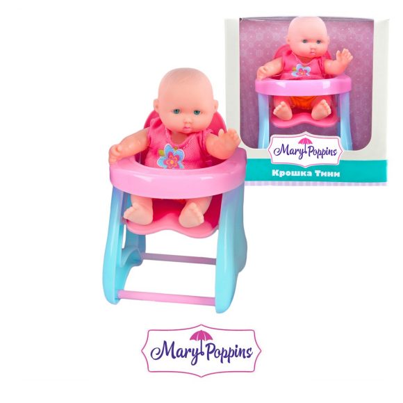 Кукла-пупс высотой 12 см. Ручки и ножки у куколки двигаются. Поставляется в комплекте с детским стульчиком для кормления. Одета в майку и трусики. Куклу можно купать. Предназначена для сюжетно-ролевой игры и эмоционального развития. Рекомендованный возраст: 3 года +.