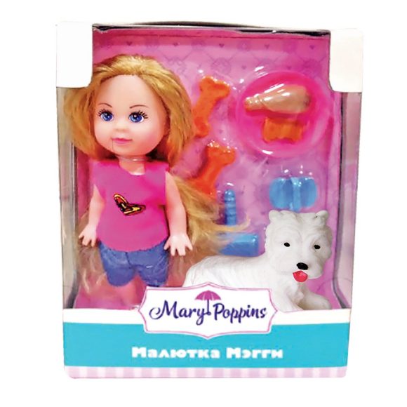 Куколка из эксклюзивной тематической серии "Малютка Мэгги" торговой марки Mary Poppins. Высота куколки 9 см. В набор входит сама куколка, ее маленький домашний питомец, тарелка для питомца и его любимые лакомства, расческа. Рекомендованный возраст: 3 года +.