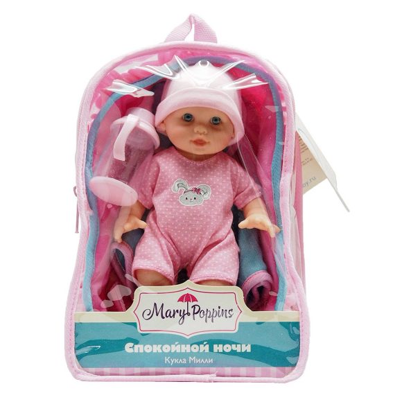 Малышка Милли - классическая кукла с твердым тельцем, подвижными ручками и ножками. Куклу можно купать в ванночке, укладывать спать и брать с собой на прогулку в уютной кроватке-переноске, входящей в комплект. К кроватке прилагается подушечка и одяло. Рост куклы 20 см. Кукла одета в комбинезон с фирменным принтом "Зайка" и в шапочку. В наборе также есть фартучек-слюнявчик, текстильный подгузник на липучках и бутылочка. Кукла упакована в прозрачную сумочку на молнию. Рекомендованный возраст: 3 года +.