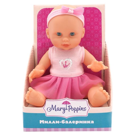 Малышка Милли - классическая кукла с твердым тельцем, подвижными ручками и ножками. Куклу можно купать в ванночке, укладывать спать и брать с собой на прогулку. Рост куклы 20 см. Кукла одета в милое платьице балерины с юбочкой из фатина. На голове у куколки повязка с бантом. Рекомендованный возраст: 3 года +.