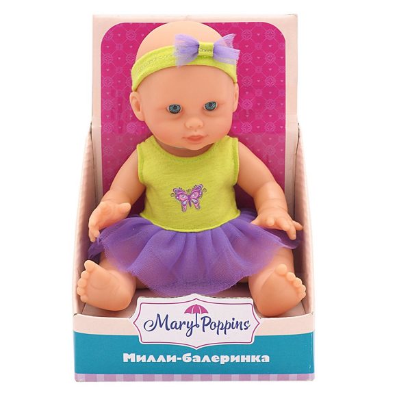 Малышка Милли - классическая кукла с твердым тельцем, подвижными ручками и ножками. Куклу можно купать в ванночке, укладывать спать и брать с собой на прогулку. Рост куклы 20 см. Кукла одета в милое платьице балерины с юбочкой из фатина. На голове у куколки повязка с бантом. Рекомендованный возраст: 3 года +.