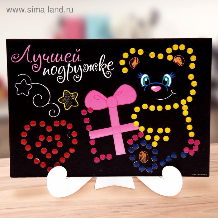 Аппликация А5 "Лучшей подружке" с круглыми клеевыми стразами, 6 цветов даст малышу возможность ощутить себя настоящим творцом и подарит юному художнику невероятное удовольствие от процесса декорирования! На лицевой стороне располагается красочная картинка с весёлым и занимательным сюжетом, которую нужно украсить голографическими клеевыми стразами.