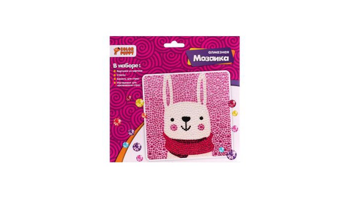 Оформить блестящую как на солнечном свету, так при искусственном освещении мозаику совершенно не сложно! Сначала все предметы набора нужно удобно расположить перед собой на столе, а затем воткнуть инструмент для выкладывания страз в розовый квадрат. С помощью этого инструмента девочке предстоит брать стразы из ёмкости. Выкладывать стразы на основу необходимо в соответствии со схемой. Когда рисунок будет готов, на обратной стороне мозаики можно будет разложить подставку!