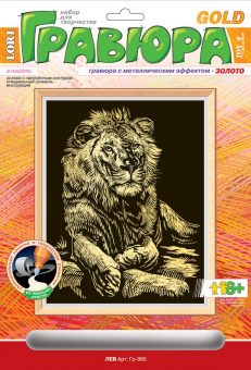 Гравюра с металлическим эффектом золота "Лев". Набор для творчества будет развивать у ребёнка внимательность, усидчивость и образное мышление. Картинка заполняется короткими штрихами с помощью специального штихеля, при этом все сделанные черточки должны иметь одинаковое направление.