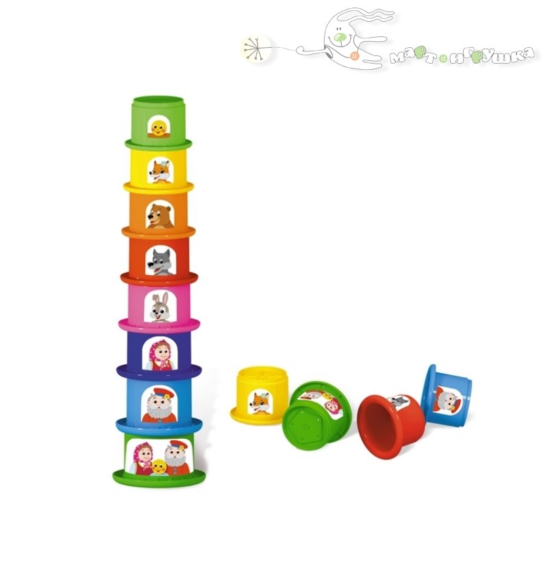 Это яркая и увлекательная пирамидка, в виде разноцветных стаканчиков, на которых изображены герои сказки «Колобок».