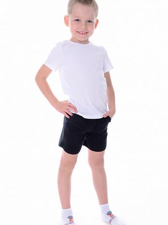 Костюм с черными шортами и белой футболкой.